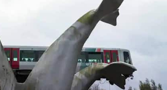 ഇത് ആരുടെ കരുതല്... പാളം തെറ്റിയ മെട്രോ ട്രെയിന് രക്ഷകനായി ഒരു തിമിംഗല ശില്പം
