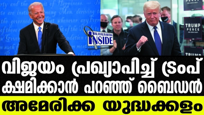 പ്രസിഡന്റ് ഡൊണാൾഡ് ട്രംപ് നിലവിൽ തന്റെ വിജയം പ്രഖ്യാപിച്ചിരിക്കുകയാണ്; എണ്ണി തീർന്ന വോട്ടുകളുടെ അടിസ്ഥാനത്തിൽ വിജയം തനിക്ക് സുനിശ്ചിതം ആണെന്നാണ് ട്രംപിന്റെ അവകാശ വാദം, ഉറപ്പിക്കാറായിട്ടില്ലെന്ന് ബൈഡൻ