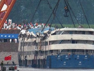 തിങ്കളാഴ്ചയാണു ചരക്കുകപ്പല് മറിഞ്ഞത്. 2,200 ടണ് കേവു ഭാരവും നാലുനിലകളുമുള്ള കപ്പല് അതിസാഹസികമായാണു ക്രെയിനുകള് ഉപയോഗിച്ച് ഉയര്ത്തിയത്. കപ്പലിന് വലിയ കേടുപാടുണ്ടായിട്ടുണ്ട്. ചൈനയിലെ കിഴക്കന് പട്ടണമായ നന്ജിങ്ങില് നിന്നും തെക്ക് കിഴക്ക് പട്ടണമായ ചോങ്ക്വിങ്ങിലേക്ക് പോയ ഈസ്റ്റേണ് സ്റ്റാര് എന്ന കപ്പലാണ് മുങ്ങിയത്. മധ്യചൈനയിലെ ഹുബൈ പ്രവിശ്യയില് ഉണ്ടായ ചുഴലി മൂലമാണു കപ്പല് മറിഞ്ഞതെന്ന് അധികൃതര് അറിയിച്ചു. 11 ദിവസത്തെ യാത്രയ്ക്കായി പുറപ്പെട്ട കപ്പലാണ് യാത്ര തുടങ്ങി അധികം വൈകാതെ മറിഞ്ഞത്.