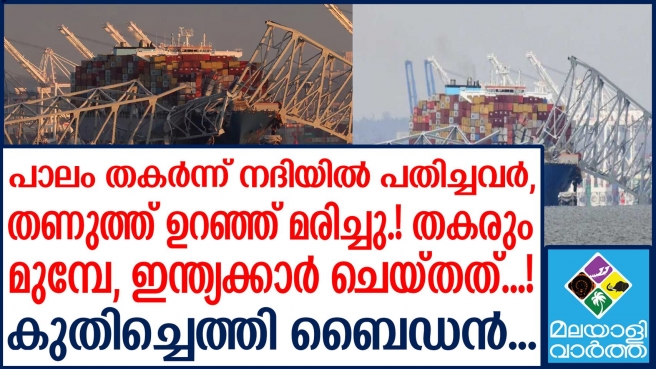ബാൾട്ടിമോറിൽ കപ്പലിടിച്ചതിനെ തുടര്ന്ന് പാലം തകര്ന്നുണ്ടായ അപകടത്തിൽ ആറുപേർ മരിച്ചതായി അമേരിക്കൻ കോസ്റ്റ് ഗാർഡ്:- കപ്പലിനുണ്ടായ വൈദ്യുതി തടസമാണ് അപകടത്തിന് കാരണമെന്നാണ് പ്രാഥമിക വിവരം: ചരക്കുകപ്പലിന്റെ മാനേജിങ് കമ്പനി മലയാളിയുടേത്...