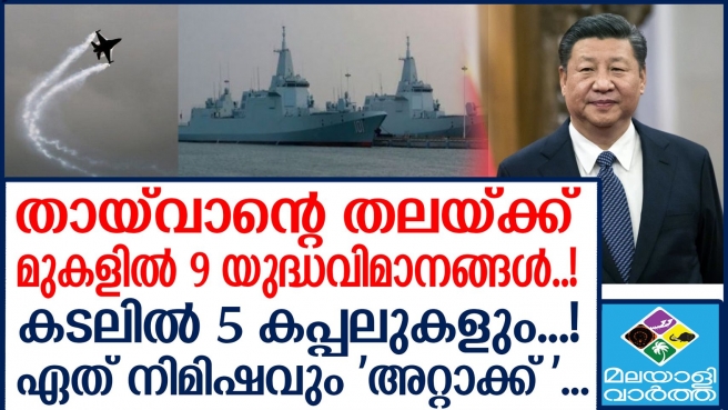 തായ്വാന്റെ അതിർത്തിക്ക് ചുറ്റും ഒൻപത് ചൈനീസ് സൈനിക വിമാനങ്ങളും, അഞ്ച് കപ്പലുകളും കണ്ടെത്തിയതായി തായ്വാൻ പ്രതിരോധ മന്ത്രാലയം...തായ്വാൻ സ്ഥിതിഗതികൾ നിരീക്ഷിക്കുകയാണെന്നും വ്യക്തമാക്കി...