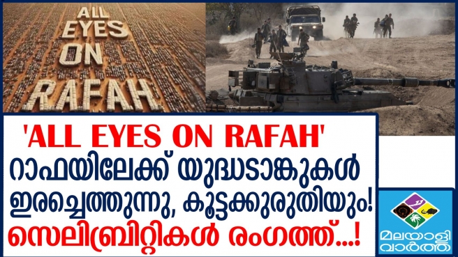 'ALL EYES ON RAFAH' ...ദിവസം കഴിയുന്തോറും റഫയിലെ കൂടുതല് പ്രദേശങ്ങളിലേക്ക് കടന്ന് ചെന്നുകൊണ്ട് ആക്രമണം ശക്തമാക്കുകയാണ് ഇസ്രായേല്...നിരവധി ഇന്ത്യന് സെലിബ്രിറ്റികളും റഫയ്ക്ക് പിന്തുണയുമായി രംഗത്ത് എത്തിയിട്ടുണ്ട്...