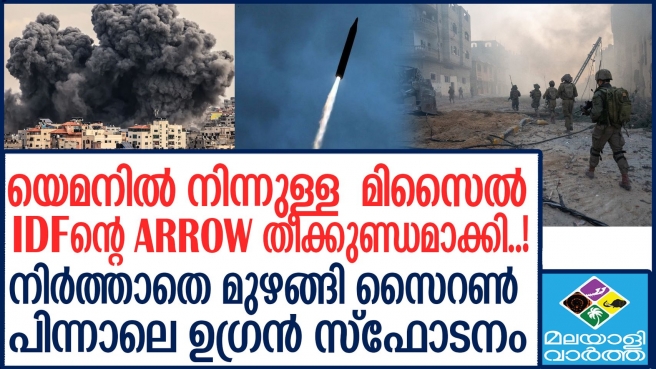 യെമനിൽ നിന്ന് വീണ്ടും മിസൈൽ. ഇസ്രായേലിലേക്ക് വന്ന മിസൈൽ രാജ്യത്തിൻ്റെ നൂതനമായ "ആരോ" ഏരിയൽ ഡിഫൻസ് സിസ്റ്റം വിജയകരമായി തകർത്തതായി ഇസ്രായേൽ പ്രതിരോധ സേന അവകാശപ്പെട്ടു. " യെമനിൽ നിന്ന് ഇസ്രായേലിലേക്ക് ഒരു മിസൈൽ തൊടുത്തുവിട്ടു , അത് "ആരോ" ഏരിയൽ ഡിഫൻസ് സിസ്റ്റം വിജയകരമായി തടഞ്ഞു. സൈറണുകളും സ്ഫോടനങ്ങളും ഉയർന്നുവെന്നും പ്രതിരോധ സേന പറഞ്ഞു.