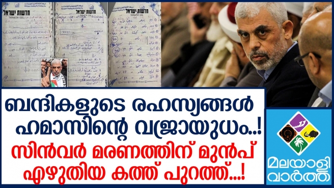 യഹ്യാ സിന്വര് എഴുതിയ കത്ത് പുറത്തുവിട്ട് ഇസ്രയേല്...ഇസ്രയേലുമായുളള യുദ്ധം അവസാനിപ്പിക്കാനുള്ള ഏക വഴി ബന്ദികള് മാത്രമാണ് എന്നാണ് സിന്വര് കത്തില് ചൂണ്ടിക്കാട്ടുന്നത്...പറഞ്ഞിരിക്കുന്ന മറ്റുള്ള കാര്യങ്ങൾ...