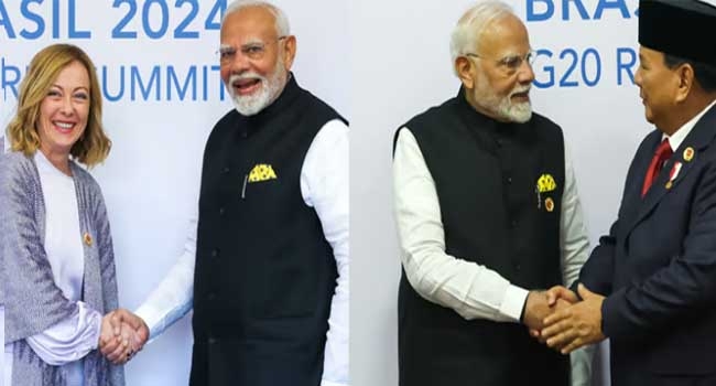 നൈജീരിയയിലെ ദ്വിദിന പര്യടനം പൂര്ത്തിയാക്കി ഞായറാഴ്ച ബ്രസീലിലെത്തിയ മോദി ഇറ്റാലിയന് പ്രധാനമന്ത്രി ജോര്ജിയ മെലോണിയുമായി കൂടിക്കാഴ്ച നടത്തി.
