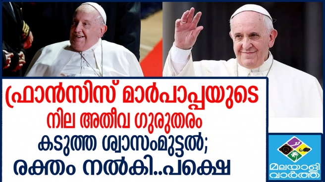 ശ്വാസകോശ അണുബാധ മൂലം 9 ദിവസമായി ആശുപത്രിയിൽ കഴിയുന്ന ഫ്രാൻസിസ് മാർപാപ്പയുടെ ആരോഗ്യനില വീണ്ടും മോശമായതായി വത്തിക്കാൻ ഇന്നലെ വൈകിട്ട് അറിയിച്ചു. കഴിഞ്ഞ ദിവസം അൽപം മെച്ചപ്പെട്ടിരുന്നെങ്കിലും ഇന്നലെ രാവിലെ സ്ഥിതി പെട്ടെന്നു മോശമാകുമായിരുന്നെന്നു. തുടർച്ചയായി ശ്വാസംമുട്ടലുണ്ടായി. ഓക്സിജൻ നൽകേണ്ടി വന്നു. തുടർന്നു നടത്തിയ പരിശോധനകളിൽ രക്തത്തിൽ പ്ലേറ്റ്ലെറ്റ് അളവു കുറഞ്ഞതുമൂലമുള്ള വിളർച്ചയും സ്ഥിരീകരിച്ചു.
