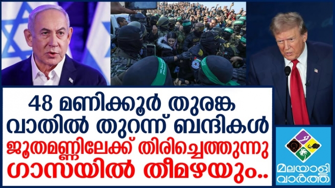 ഹമാസ് ബന്ദികൾ ഉടൻ തിരികെയെത്തുമോ . ഹമാസിനെ നിരായിധീകരിക്കുന്ന കാര്യത്തില് വിട്ടുവീഴ്ച്ചയില്ലെന്നും ബന്ദികള് വീട്ടിലേക്ക് മടങ്ങിയത്തുമെന്നും പ്രഖ്യാപിച്ചു ഇസ്രായേല് പ്രധാനമന്ത്രി ബെഞ്ചമിന് നെതന്യാഹു. ട്രംപ് മുന്നോട്ടു വെച്ച ഗാസ സമാധാന ഉടമ്പടി കരാര് ചര്ച്ച ചെയ്യുന്നതിനായി ഇസ്രായേലില് നിന്നുള്ള ഒരു സംഘം ഈജിപ്തിലേക്ക് പോകുമെന്നും നെതന്യാഹു അറിയിച്ചു. ഹമാസുമായുള്ള ചര്ച്ചകള് നടക്കുക ഈജിപ്തില് വെച്ചാകും.
