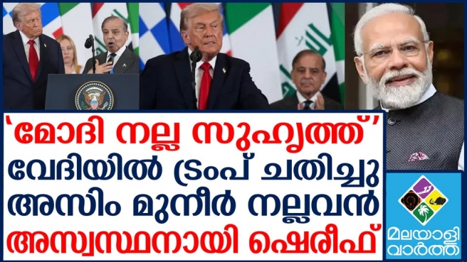 ഈ സമയം, അസ്വസ്ഥതയോടെ പാക് പ്രധാനമന്ത്രി അദ്ദേഹത്തിന് പിന്നില് നില്ക്കുന്നുണ്ടായിരുന്നു. ഇതിന് പിന്നാലെ ഷെരിഫിനെ വീണ്ടും കുഴപ്പത്തിലാക്കി ട്രംപിന്റെ അടുത്ത വാക്കുകളും വന്നു. ഏതാനും നിമിഷങ്ങള്ക്കുശേഷം യുഎസ് പ്രസിഡന്റ് ഇന്ത്യയെ പ്രശംസിച്ചു. പ്രധാനമന്ത്രി നരേന്ദ്ര മോദിയെ 'വളരെ നല്ല സുഹൃത്ത്' എന്നും അതിശയകരമായ പ്രവര്ത്തനങ്ങള് കാഴ്ചവെച്ച വ്യക്തിയെന്നും വിശേഷിപ്പിച്ചു.തൊട്ടുപിന്നാലെ പാകിസ്താനും ഇന്ത്യയും ഒരുമിച്ച് വളരെ നന്നായി മുന്നോട്ടുപോകുമെന്ന് താന് കരുതുന്നുവെന്നും പിന്നില് നില്ക്കുന്ന ഷെരീഫിനോടായി അങ്ങനെയല്ലേയെന്ന് ട്രംപ് ചോദ്യമുന്നയിച്ചു.