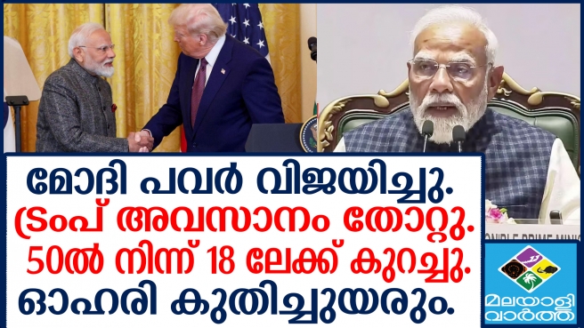 അവസാനം ഇന്ത്യയുടെ പവര് ട്രം പ് അറിഞ്ഞു. അമേരിക്കൻ പ്രസിഡന്റ് ഡോൺൾഡ് ട്രംപുമായി ഫോണിൽ സംസാരിച്ചുവെന്ന് നരേന്ദ്ര മോദി. 18 ശതമാനത്തിലേക്ക് തീരുവ കുറച്ചതിന് ട്രംപിന് നന്ദിയെന്ന് മോദി എക്സിലും ഫേസ്ബുക്കിലും കുറിച്ചു. എന്നാൽ, വ്യാപാര കരാർ ആയെന്ന് സ്ഥിരീകരിക്കാതെയായിരുന്നു പ്രധാനമന്ത്രിയുടെ പ്രതികരണം. 'വ്യാപാര കരാർ' എന്ന പരാമർശം പോസ്റ്റിൽ ഉപയോഗിച്ചില്ല. അതേ സമയം, ട്രംപിൻറെ നേതൃത്വം ലോകസമാധാനത്തിന് സഹായകരമെന്നും ട്രംപിൻറെ സമാധാന ശ്രമങ്ങളെ പിന്തുണയ്ക്കുമെന്നും പ്രധാനമന്ത്രി. രണ്ടു സാമ്പത്തിക വ്യവസ്ഥകൾ ഒന്നിച്ചു വരുന്നത് ജനങ്ങൾക്ക് ഗുണകരമാണെന്നും അദ്ദേഹം കൂട്ടിച്ചേർത്തു. ഇതോടെ, റഷ്യൻ എണ്ണ വാങ്ങുന്നതിന് ഏർപ്പെടുത്തിയ 25 ശതമാനം അധിക തീരുവയും പിൻവലിക്കും. ഇന്ത്യയ്ക്കുള്ള യുഎസ് തീരുവ 50ൽ നിന്ന് 18 ലേക്ക് ആകും.