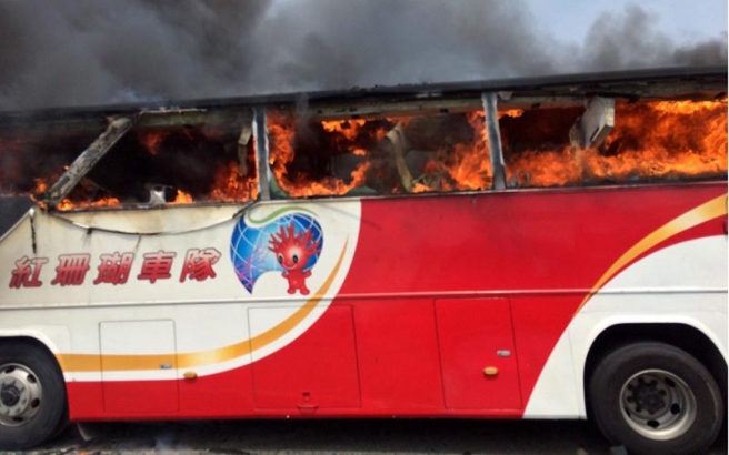 ടായുവാന് മേഖലയിലെ എയര്പോര്ട്ട് എക്സ്പ്രസ്സ് വെയിലൂടെ സഞ്ചരിക്കുന്നതിനിടയില് ബസിന്റെ നിയന്ത്രണം വിട്ട് റോഡരികത്തുള്ള കൈവരിയിലിടിക്കുകയും, തുടര്ന്നു ബസിനു കത്തു പിടിക്കുകയായിരുന്നു. അപകടത്തില് ബസിലെ യാത്രക്കാരായ 24 പേരും സ്വദേശിയായ ഡ്രൈവറും ഒരു ടൂറിസ്റ്റ് ഗൈഡുമാണ് മരിച്ചത്.