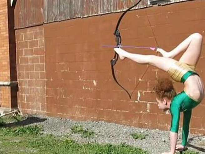 ഹാന്ഡ്സ്റ്റാന്റില് കൈകള് ഉറപ്പിച്ച ശരീരം നന്നായി പുറകുവശത്തേക്ക് വളച്ച് കാല് കൊണ്ട് അമ്പെയ്ത് ഈ കൊച്ചു പെണ്കുട്ടി ലക്ഷ്യത്തില് കൊള്ളിക്കും. സ്വന്തമായി 'ഫൂട്ട് ആര്ച്ചര്' എന്ന് വിശേഷിപ്പിക്കുന്ന ഈ കൊച്ചു ജിംനാസ്റ്റ് അകലത്തില് ഉറപ്പിച്ച ബലൂണില് അമ്പെയ്ത് കൊള്ളിക്കുന്നതിന്റെ വീഡിയോ ഇതിനകം ഹിറ്റാണ്.