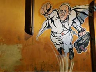 ഫ്രാന്സിസ് മാര്പാപ്പ കറുത്ത ബാഗുമായി, മുഷ്ടി ചുരുട്ടി വായുവില് കുതിക്കുന്നു.. അനീതിക്കെതിരെ പോരാടുന്ന സൂപ്പര്മാനായി ഫ്രാന്സിസ് മാര്പാപ്പയെ ചിത്രീകരിച്ചുളള അജ്ഞാതന്റെ ഈ ചുവര്ചിത്രം വത്തിക്കാന് ട്വിറ്റ് ചെയ്തു.