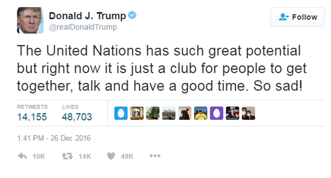 ഐക്യരാഷ്ട്രസഭയെ ചെറുതായൊന്ന് താക്കീത് ചെയ്യാനും ട്രംപ് മടിച്ചില്ല. ജനുവരി ഇരുപതിന് ശേഷം ഐക്യരാഷ്ട്രസഭയ്ക്ക് കാര്യങ്ങള് വ്യത്യസ്തമായിരിക്കും എന്നാണ് ട്രംപ് പറഞ്ഞിരിക്കുന്നത്. ജനുവരി 20നാണ് ഡൊണാള്ഡ് ട്രംപ് അമേരിക്കയുടെ പ്രസിഡണ്ടായി സ്ഥാനമേല്ക്കുക.മറ്റൊരു ട്വീറ്റില് തന്റെ വിജയത്തിന് ശേഷം ലോകം ഉണര്വിലേക്കാണ് എന്നും ട്രംപ് പറയുന്നുണ്ട്.