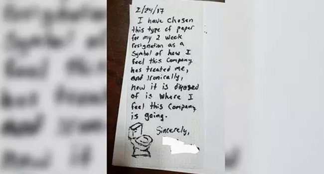 എന്നാല് വ്യത്യസ്തമായ രീതിയില് ഒരാള് ബോസിനോട് പകരം വീട്ടി ലോക ശ്രദ്ധ പിടിച്ചു പറ്റി. താന് ജോലി രാജി വെക്കുന്നതായി ടോയ്ലറ്റ് പേപ്പറില് എഴുതി നല്കി താങ്കളുടെ കമ്പനിക്ക് ഈ ടോയ്ലറ്റ് പേപ്പറിന്റെ വില മാത്രമേ കല്പ്പിക്കുന്നുള്ളൂ എന്ന് ബോധ്യപ്പെടുത്തി കൊടുത്തു. അമേരിക്കയിലെ സാമൂഹിക വാര്ത്താ ഏജന്സിയായ റെഡിറ്റ് ആണ് ഫെബ്രുവരി 24 ന് ലഭിച്ച അപൂര്വ രാജിക്കത്ത് പുറത്ത് വിട്ടിരിക്കുന്നത്. 'എന്റെ ഭര്ത്താവിന്റെ രാജിക്കത്ത്' girlofgodsbadday എന്ന പേരിലാണ് കത്ത് പോസ്റ്റ് ചെയ്യപ്പെട്ടിട്ടുള്ളത്. ഇവരുടെ മറ്റു വിവരങ്ങള് പുറത്തു വിട്ടിട്ടില്ല .