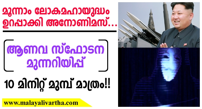 'വരുന്നത് കൊടുംക്രൂരവും പൈശാചികവുമായ യുദ്ധം. അതിന് തുടക്കം കുറിക്കുന്നതാകട്ടെ വളരെ പെട്ടെന്നും. പല രാജ്യങ്ങളും ഇത് നേരിടാന് മുന്നൊരുക്കങ്ങള് ആരംഭിച്ചു കഴിഞ്ഞു. തങ്ങളുടെ തന്ത്രപ്രധാനമായ ഇടങ്ങളിലെല്ലാം അവര് നീക്കങ്ങള് നടത്തുകയാണ്. ജനം ശ്രദ്ധയോടെയിരിക്കുക, മൂന്നാം ലോകമഹായുദ്ധം നമ്മുടെ പടിവാതില്ക്കലെത്തുകയാണ്...' ഹാക്കര്മാരുടെ രാജ്യാന്തര രഹസ്യക്കൂട്ടായ്മയായ അനോണിമസിന്റെ ഔദ്യോഗിക യൂട്യൂബ് ചാനലില് കഴിഞ്ഞ ദിവസം പ്രത്യക്ഷപ്പെട്ട വീഡിയോയിലെ വിവരണമാണിത്.