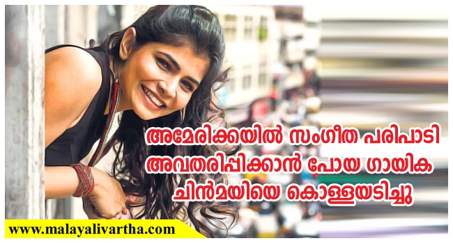 അമേരിക്കയില് സാന്ഫ്രാന്സിസ്കോയില് സംഗീത പരിപാടി അവതരിപ്പിക്കാന് പോയ ഗായിക ചിന്മയിയെ കൊള്ളയടിച്ചു. ഗായികയുടെ പാര്ക്ക് ചെയ്തിരുന്ന കാറ് തല്ലിത്തകര്ത്താണ് അക്രമി സംഘം വിലപ്പെട്ട സാധനങ്ങള് കൊണ്ടുപോയത്. ട്വിറ്ററിലൂടെയാണ് ചിന്മയി ഇക്കാര്യം ലോകത്തെ അറിയിച്ചത്. എന്തൊക്കെ നഷ്ടമായതെന്നു വ്യക്തമായിട്ടില്ല. അമേരിക്കയില് സംഗീത പര്യടനം നടത്തുകയാണ് ചിന്മയി.