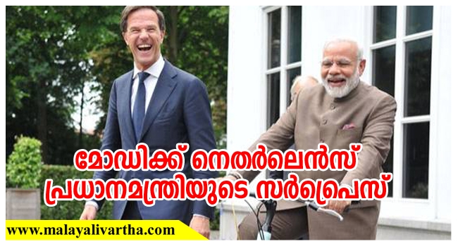 മോദിക്ക് അപ്രതീക്ഷിത സമ്മാനം നല്കി നെതര്ലെന്സ് പ്രധാനമന്ത്രി. നരേന്ദ്ര മോദിയുടെ തൃരാഷ്ട്ര സന്ദര്ശനത്തിന്റെ ഭാഗമായാണ് നെതര്ലെന്സില് അപ്രതീക്ഷിത സമ്മാനം നല്കിയത്. ഡച്ച് പ്രധാനമന്ത്രി മാര്ക്ക് റൂട്ടാണ് അപ്രതീക്ഷിതസമ്മാനാമായ സൈക്കിള് അദ്ദേഹത്തിന് നല്കിയത്. സമ്മാനത്തിന് നന്ദി പറഞ്ഞ് ഇരുവരും നില്ക്കുന്ന ചിത്രം പ്രധാനമന്ത്രി തന്നെയാണ് ട്വിറ്റ് ചെയ്തത്.