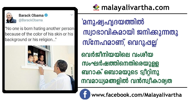 വെർജീനിയയിലെ ചാർലറ്റ്സ്വിലിലുണ്ടായ വംശീയ സംഘർഷത്തിനെതിരെ യുഎസ് മുൻ പ്രസിഡന്റ് ബറാക് ഒബാമയുടെ ട്വീറ്റിനു വൻ വരവേൽപ്. ആദ്യദിവസം തന്നെ 12 ലക്ഷം തവണ റീട്വീറ്റ് ചെയ്യപ്പെട്ട സന്ദേശം 28 ലക്ഷം ലൈക്കുകൾ നേടി ട്വിറ്റർ ചരിത്രത്തിൽ തരംഗമായി.