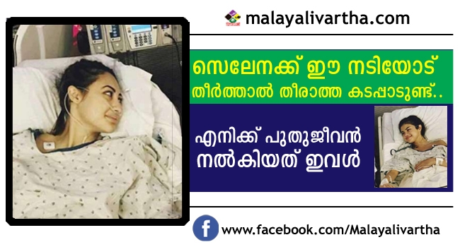 താന് കിഡ്നി മാറ്റിവെക്കല് ശസ്ത്രക്രിയക്ക് വിധേയമായതായി ഇൻസ്റ്റാഗ്രാമിൽ ഗായിക വെളിപ്പെടുത്തി. ഇതിനൊടൊപ്പം ആശുപത്രിയില് കഴിയുന്ന ചിത്രവും സെലേന പോസ്റ്റ് ചെയ്തിട്ടുണ്ട്. ഉറ്റസുഹൃത്തും നടിയുമായ ഫ്രാന്സിക്ക റെയിസാണ് സെലേനക്ക് കിഡ്നി ദാനം ചെയ്ത് പുതുജീവിതം നല്കിയത്.
