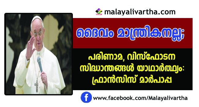 മനുഷ്യന്റെ ഉത്ഭവത്തെ കുറിച്ചുള്ള ശാസ്ത്ര സിദ്ധാന്തങ്ങളെ തള്ളിപ്പറയാനാവില്ലെന്ന് ഫ്രാന്സിസ് മാര്പാപ്പ. പരിണാമ വാദവും വിസ്ഫോടന സിദ്ധാന്തവും യഥാര്ത്ഥ്യമാണെന്ന് പറഞ്ഞ പോപ്പ്, 'ഒരു മാന്ത്രിക ദണ്ഡ് കൈവശമുള്ള മാന്ത്രികനല്ല ദൈവമെന്നും' പ്രസ്താവിച്ചു. പൊന്തിഫിക്കല് അക്കാദമി ഓഫ് സയന്സസില് നടന്ന ചര്ച്ചയിലാണ് പോപ്പ് ക്രൈസ്തവ സഭയുടെ വിശ്വാസത്തെ തന്നെ ചോദ്യം ചെയ്യപ്പെടുന്ന പ്രഖ്യാപനം നടത്തിയത്.