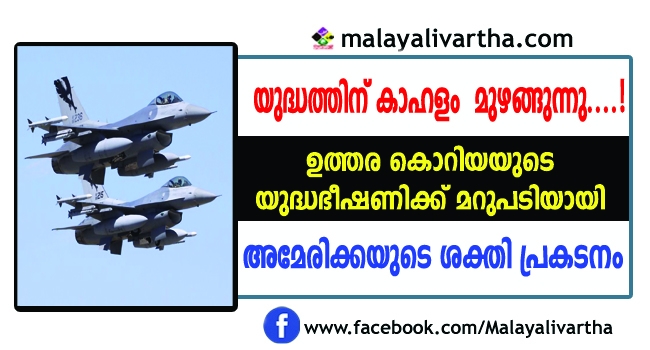 ഉത്തര കൊറിയയുടെ യുദ്ധഭീഷണിക്ക് മറുപടിയായി അമേരിക്കയുടെ ശക്തി പ്രകടനം. കൊറിയന് ഉപദ്വീപുകള്ക്ക് മുകളിലൂടെ യുദ്ധവിമാനങ്ങള് പറത്തിയാണ് അമേരിക്ക ശക്തിപ്രകടനം നടത്തിയത്. നാല് ഫൈറ്റര് ജെറ്റ് വിമാനങ്ങളും രണ്ട് ബോംബര് വിമാനങ്ങളുടെ കൊറിയയുടെ ആകാശത്ത് കൂടി അമേരിക്ക പറത്തി. എഫ്-35ബി ഫൈറ്റര് ജെറ്റ് വിമാനങ്ങളും ബി-1ബി ബോംബര് വിമാനങ്ങളുമാണ് പറത്തിയത്.