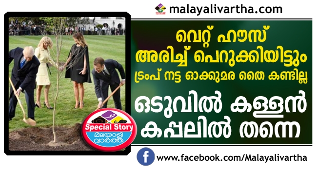 അമേരിക്കന് പ്രസിഡണ്ട് ഡോണള്ഡ് ട്രംപ് നട്ട ഓക്കുമരതൈ കണ്ടെത്തി. വൈറ്റ് ഹൗസിലെ മനോഹരമായ പുല്തകിടിയില് അമേരിക്കന് പ്രസിഡണ്ട് ഡോണള്ഡ് ട്രംപ് നട്ട ഓക്കുമരതൈ അപ്രത്യക്ഷമായിരുന്നു. കഴിഞ്ഞ ആഴ്ചയാണ് ഫ്രഞ്ച് പ്രസിഡണ്ട് ഇമ്മാനുവല് മാക്രോ വാഷിംഗ്ടണില് ട്രംപിന് ഓക്കുമരത്തൈ സമ്മാനിച്ചത്. ഇരുവരും ചേര്ന്ന് തൈ നടുകയും ആ ചരിത്ര നിമിഷം ലോകം മുഴുവന് ശ്രദ്ധിക്കുകയും ചെയ്തിരുന്നു. എന്നാല് പിന്നീടാണ് തൈ അപ്രത്യക്ഷമായത്.