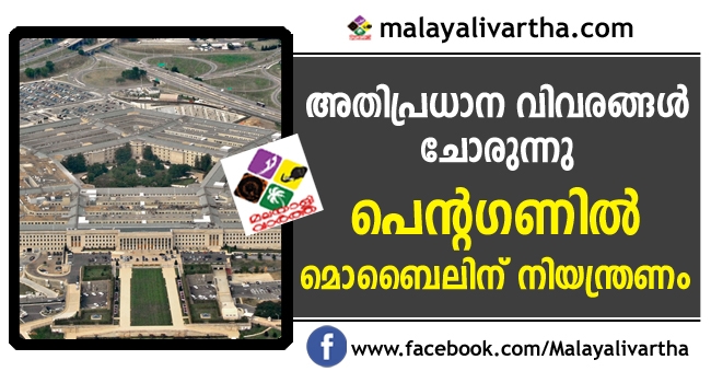 അതിപ്രധാന വിവരങ്ങള് ചോരുന്ന പശ്ചാത്തലത്തില് പെന്റഗണില് മൊബൈല് ഫോണുകളുടെയും മറ്റു ഇലക്ട്രോണിക് ഉപകരണങ്ങളുടെയും ഉപയോഗത്തിന് നിയന്ത്രണങ്ങള് ഏര്പ്പെടുത്തുന്നു. അതീവരഹസ്യ സ്വഭാവമുള്ള വിവരങ്ങള് കൈകാര്യം ചെയ്യുന്ന ഇടങ്ങളില് നിയന്ത്രണങ്ങള് ഏര്പ്പെടുത്തി കൊണ്ടുള്ള പുതിയനയം യു എസ് പ്രതിരോധ വകുപ്പ് അവതരിപ്പിച്ചു. പെന്റഗണ് കെട്ടിടത്തിനുള്ളില് തുടര്ന്നും മൊബൈല് ഫോണുകള് കൊണ്ടുപോകാം. ക്ലാസ്സിഫൈഡ് രേഖകള് സൂക്ഷിച്ചിട്ടില്ലാത്ത പെന്റഗണ് ഓഫീസുകളിലും പൊതുഇടങ്ങളിലും മൊബൈല് പ്രവേശിപ്പിക്കാം.