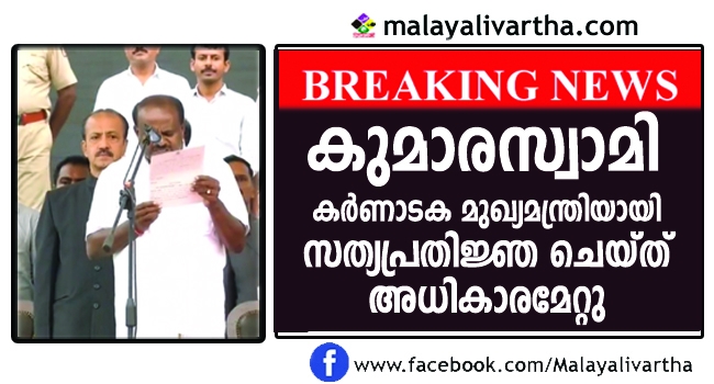 കനത്ത മഴയെ തുടര്ന്നുണ്ടായ പ്രതികൂലാന്തരീക്ഷത്തിനിടെ കര്ണാടക സംസ്ഥാനത്തിന്റെ 24ാം മുഖ്യമന്ത്രിയായി എച്ച്.ഡി. കുമാരസ്വാമി സത്യപ്രതിജ്ഞ ചെയ്ത് അധികാരമേറ്റു. മുഖ്യമന്ത്രി പദത്തില് കുമാരസ്വാമിക്ക് ഇത് രണ്ടാം ഊഴമാണ്. കുമാരസ്വാമിക്കൊപ്പം ജി.പരമേശ്വര ഉപമുഖ്യമന്ത്രിയായും സത്യപ്രതിജ്ഞ ചെയ്തു. കെ.പി.സി.സി അദ്ധ്യക്ഷന് ജി. പരമേശ്വര ഉപമുഖ്യമന്ത്രിയായും ചുമതലയേറ്റു. വിധാന് സൗധയില് നടന്ന ചടങ്ങില് ഗവര്ണര് വാജുഭായ് വാല സത്യവാചകം ചൊല്ലിക്കൊടുത്തു.