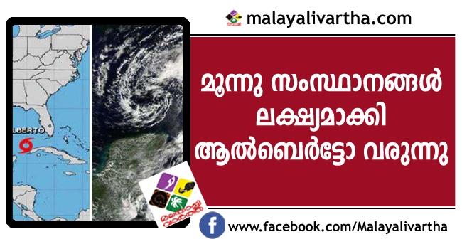 യു എസ്സിലെ മൂന്നു സംസ്ഥാനങ്ങള് ലക്ഷ്യമാക്കി ആല്ബെര്ട്ടോ ചുഴലിക്കാറ്റ് വരുന്നു എന്ന് റിപ്പോർട്ട്