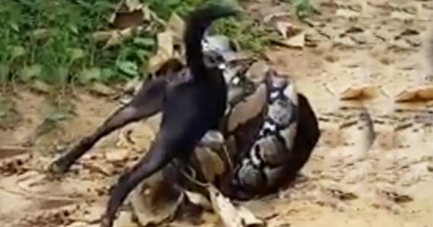 പെരുമ്പാമ്പിന്റെ പിടി മുറുകി വരുമ്പോള് ഒരു ഘട്ടത്തില് നായയുടെ അനക്കം നിലയ്ക്കുന്നുപോലുമുണ്ട്. ശേഷം രക്ഷകരുടെ ശ്രമം ഒരു ഘട്ടത്തില് അല്പം വിജയിക്കുന്നതോടെ നായയുടെ കാലുകള് അല്പം സ്വതന്ത്രമാകുന്നു. ഇതിനിടയില് ഒരാള് പെരുമ്പാമ്പിന്റെ വാല് ഭാഗത്ത് പിടിച്ച് വലിക്കുന്നു. അതോടെ നായയ്ക്കു മേലുള്ള പാമ്പിന്റെ ചുറ്റുകള് ഓരോന്നായി അഴിയുന്നു. എന്നാലും നായയുടെ തലഭാഗം വിഴുങ്ങുന്നതിനായി തലയില് കടിച്ചു പിടിച്ചിരിക്കുകയാണ് പാമ്പ്.