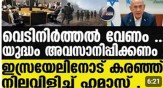 ഗാസയിൽ വെടിനിർത്തലിന് തയാറാവുകയാണെങ്കിൽ യുദ്ധം അവസാനിപ്പിക്കാമെന്ന് ഇസ്രയേലിനോട് ഹമാസ്. ഇസ്രായേൽ ചാര മേധാവി നടത്തിയ ചർച്ചയിൽ വെടിനിർത്തൽ കരാർ അവതരിപ്പിക്കുകയാണെങ്കിൽ പോരാട്ടം അവസാനിപ്പിക്കാമെന്നാണ് ഹമ...