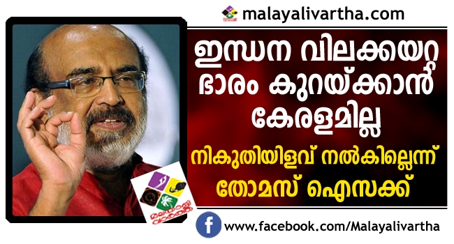 രാജ്യമാകമാനം പെട്രോളിന് വിലവർദ്ധനവ് ഉണ്ടായപ്പോൾ ആശ്വാസമായത് സംസ്ഥാന സർക്കാരിന്റെ ഇടപെടൽ ആയിരുന്നു . പക്ഷെ ഇനിയും ഇന്ധന വില ഉയർന്നാൽ സംസ്ഥാനസർക്കാർ ഇത്തരത്തിൽ ഇടപെട്ട് നികുതി കുറയ്ക്കില്ലെന്ന് ധനമന്ത്രി തോമസ് ഐസക്ക്.
