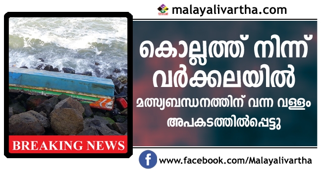 കൊല്ലം ജില്ലയില് നിന്നും മല്സ്യബന്ധനത്തിനായി വന്ന വള്ളം വര്ക്കല താലൂക്കില് ഇടവ വില്ലേജില് കാപ്പില് ഭാഗത്ത് അപകടത്തില്പ്പെട്ടു. ഒരാളെ കാണാതായി. കൂടെയുണ്ടായിരുന്ന ഒരാള് നീന്തി കരയിലെത്തി. ഇയാളെ വര്ക്കല ഗവ: ആശുപത്രിയില് പ്രവേശിപ്പിച്ചു. മറ്റൊരാളിനെ മറ്റ് വള്ളങ്ങളിലെ മല്സ്യത്തൊഴികലാളികള് രക്ഷപ്പെടുത്തി. മൂന്നു പേരാണ് വള്ളത്തില് ഉണ്ടായിരുന്നതെന്ന് അറിയുന്നു. റവന്യൂ, പോലീസ് അധികൃതര് സ്ഥലത്ത് ക്യാമ്പ് ചെയ്യുന്നു. ഉള്ക്കടലില് തെരച്ചില് തുടരുന്നു.