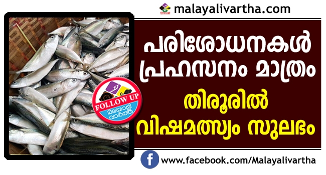 മത്സ്യത്തിൽ അമോണിയ, ഫോർമലിൻ തുടങ്ങിയ രാസവസ്തുകൾ കലർന്നിട്ടുണ്ടെന്ന റിപ്പോർട്ടുകളുടെ പശ്ചാത്തലത്തിൽ മലപ്പുറം കോട്ടപ്പടിയിലും തിരുരിലും മീൻ ചന്തകളിൽ ഭക്ഷ്യസുരക്ഷ വകുപ്പിന്റെ പരിശോധന. ഭക്ഷ്യസുരക്ഷാ ഉദ്യോഗസ്ഥർ പത്ത് കടകളിൽനിന്ന് സാന്പിളുകൾ ശേഖരിച്ചു. മൽസ്യം കഴിച്ച് മലപ്പുറത്തെ രണ്ടുവീടുകളിൽ അഞ്ച് പൂച്ചകൾ ചത്തു. പഴകിയ മൽസ്യങ്ങളുടെ തലഭാഗത്ത് അറവുശാലകിൽ നിന്നുള്ള രക്തം തളിച്ച് പുതിയ മൽസ്യമാണെന്ന് തെറ്റിദ്ധരിപ്പിച്ചാണ് വില്പന നടത്തുന്നത്.