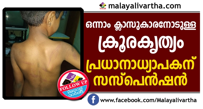 സര്ക്കാര് എല്.പി സ്കൂളിലെ ഒന്നാം ക്ലാസ് വിദ്യാര്ഥിയെ അധ്യാപിക അടിച്ചു പരിക്കേല്പ്പിച്ച സംഭവത്തില് പ്രധാനാധ്യാപകനെ സസ്പെന്ഡ് ചെയ്തു. ഗവ. എല്.പി സ്കൂള് പ്രധാനാധ്യാപകന് ബാബുരാജിനെയാണ് ജില്ലാ വിദ്യാഭ്യാസ ഡയറക്ടര് സസ്പെന്ഡ് ചെയ്തത്. ഈ ക്രൂരകൃത്യം മേലധികാരികളെ അറിയിക്കുന്നതില് വീഴ്ച വരുത്തിയെന്ന് കാണിച്ചാണ് സസ്പെന്ഷന്.