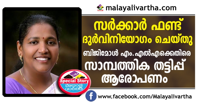 ബിജിമോൾ എം.എൽഎക്കെതിരെ സാമ്പത്തിക തട്ടിപ്പ് ആരോപണം. പെരിയാർ ടൈഗർ കൺസർവേഷൻ ഫൗണ്ടേഷനിൽ നിന്നും ആദിവാസികളടങ്ങിയ വില്ലേജ് ഇ.ഡി.സി കൾക്കായി നീക്കി വച്ചിരുന്ന ഫണ്ടിൽ നിന്നും 15,64,000 രൂപയാണ് മാനദണ്ഡങ്ങള് പാലിക്കാതെ പീരുമേട് എം എല് ഇഎസ് ബിജിമോള് സഹോദരി പ്രസിഡന്റായ സംഘടനയ്ക്ക് അനുവദിച്ചു എന്നാണ് ആരോപണം.