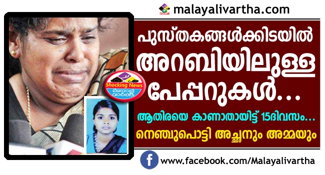 കംപ്യൂട്ടർ സെന്ററിലേക്കെന്ന് പറഞ്ഞ് ഇറങ്ങിയ ആതിരയെ കാണാതായിട്ട് പതിനഞ്ച് ദിവസം; അന്വേഷണങ്ങൾക്കിടയിൽ പുസ്തകങ്ങൾക്കിടയിൽ നിന്ന് കണ്ടെടുത്തത് അറബിയിലുള്ള പേപ്പറുകൾ: മൊബൈൽ ഫോൺ ഉപയോഗിക്കാത്ത ആതിര വീട്ടിൽ നിന്നിറങ്ങിയത് സർട്ടിഫിക്കറ്റുകളും തിരിച്ചറിയൽ രേഖകളുമടങ്ങിയ ബാഗുമായി.... മകൾ എങ്ങോട്ട് പോയെന്നറിയാതെ നെഞ്ച് തകർന്ന് അച്ഛനും അമ്മയും