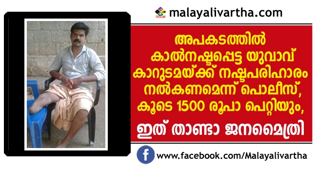അപകടത്തില് കാല് നഷ്ടപ്പെട്ട നിര്ധനനായ യുവാവ് കാറുടമയ്ക്ക് നഷ്ടപരിഹാരം നല്കണമെന്ന് ചടയമംഗലം പൊലീസ്, ഡി.ജി.പിക്ക് ഉള്പ്പെടെ പരാതി നല്കിയിട്ടും നടപടിയില്ല, ഒടുവില് പരാതി മുഖ്യമന്ത്രിയുടെ ശ്രദ്ധയില് കൊണ്ടുവരാന് സോഷ്യല് മീഡിയയെ അഭയം പ്രാപിച്ചു