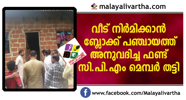 പട്ടിക ജാതി കുടുംബത്തിന് വീട് നിര്മിക്കാന് ബ്ലോക്ക് പഞ്ചായത്ത് അനുവദിച്ച നാലുലക്ഷം രൂപ സി.പി.എം മെമ്പര് തട്ടിയെടുത്തെന്ന്