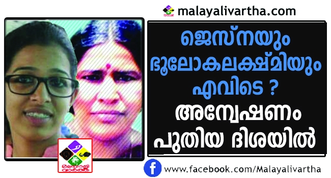 ഒരു തുമ്പും ശേഷിപ്പിക്കാതെ ജെസ്നയെന്ന കോളജ് വിദ്യാര്ഥിനിയും ഭൂലോകലക്ഷ്മിയെന്ന വീട്ടമ്മയും അപ്രത്യക്ഷരായതിലെ സമാനതയാണ് അന്വേഷണസംഘം പരിശോധിക്കുന്നത്.