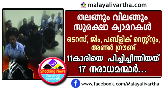 കൊടും ക്രൂരതയ്ക്കുള്ള താത്കാലിക ശിക്ഷ നടപ്പിലാക്കി അഭിഭാഷകർ; തലങ്ങും വിലങ്ങും സുരക്ഷാ ക്യാമറകള് ഉണ്ടായിരുന്ന കെട്ടിടത്തില് പതിനൊന്നുകാരിയെ ടെറസ്, ജിം, പബ്ളിക് റെസ്റ്റ്റൂം തുടങ്ങി എല്ലാ സ്ഥലങ്ങളിലും വെച്ച് ഓരോ തവണ പീഡനത്തിനിരയാക്കിയത് ഗര്ഭിണികള്ക്ക് ഉപയോഗിക്കുന്ന മരുന്ന് കുത്തിവെച്ച് ബോധംകെടുത്തി: ബാലികയെ പീഡനത്തിനിരയാക്കിയ 17 നരാധമന്മാരുടെയും വീഡിയോ കണ്ട് രസിച്ച് ലിഫ്റ്റ് ഓപ്പറേറ്റര്