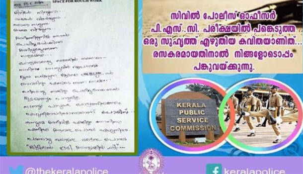 പോലീസുകാര്ക്ക് ഇത്രയും വിവരമുണ്ടെന്ന് അറിയില്ലായിരുന്നു; ഇനി താന് പൊലീസുകാരെ കുറ്റം പറയില്ല;'കിട്ടിയാല് കിട്ടി അല്ലെങ്കില് ചട്ടി' പി.എസ്.സി പരീക്ഷാ ഹാളിലെ ഹാളിലെ തന്റെ ദയനീയാവസ്ഥ കവിതയായി എഴുതിയ വിരുതന്റെ കവിത വൈറലാകുന്നു
