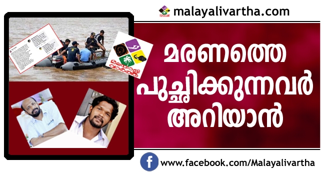 മഴക്കെടുതിയുടെ ആഴം പൊതുസമൂഹത്തെ അറിയിക്കാനായി പോയ രണ്ടു മാധ്യമപ്രവര്ത്തകര് മുങ്ങി മരിച്ച വാര്ത്തയുടെ ആഘാതത്തിലാണ് കേരളത്തിന്റെ പൊതുസമൂഹം. അതേസമയം, അവരുടെ മരണത്തെ അവേഹളിച്ചും ചിലര് വ്യാപകമായി ഫെയ്സ്ബുക്കിലൂടെ് പ്രചാരണം നടത്തുകയാണ്. മാതൃഭൂമി ന്യൂസിന്റെ ലേഖകന് സജി, ഡ്രൈവര് ബിപിന് എന്നിവരുടെ മരണത്തെയാണ് സര്ക്കാരിനെ വിമര്ശിക്കുന്ന വാര്ത്ത തേടി പോയപ്പോഴാണ് മരണം സംഭവിച്ചതെന്ന രീതിയില് സോഷ്യല് മീഡിയയിലൂടെ ചിലര് പരിഹസിക്കുന്നത്. അവരുടെ മുങ്ങിമരണം സ്വന്തം കാര്യം നോക്കി പോയപ്പോള് സംഭവിച്ചതല്ലെന്ന് ചിലര് ഓര്മ്മപ്പെടുത്തുന്നുണ്ട്.