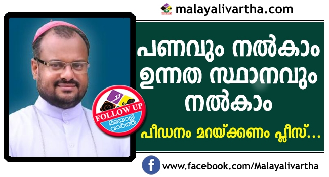 കന്യാസ്ത്രീയെ പീഡനത്തിനിരയാക്കിയെന്ന കേസിൽ നിന്നു പിന്മാറാന് ജലന്ധര് ബിഷപ്പ് ഫ്രാങ്കോ മുളയ്ക്കല് അഞ്ച് കോടി രൂപ വാഗ്ദാനം ചെയ്തതായി പരാതിക്കാരിയായ കന്യാസ്ത്രീയുടെ സഹോദരന്റെ മൊഴി. പണത്തിന് പുറമെ കന്യാസ്ത്രീക്കു സഭയില് ഉന്നത സ്ഥാനവും ബിഷപ്പ് വാഗ്ദാനം ചെയ്തതായി വൈക്കം ഡിവൈഎസ്പിക്ക് നല്കിയ മൊഴിയില് സഹോദരന് വ്യക്തമാക്കുന്നു. മതിയായ തെളിവുകളുണ്ടായിട്ടും ബിഷപ്പിനെ അറസ്റ്റ് ചെയ്യാത്തതില് അമര്ഷമുണ്ടെന്നും സഹോദരന് പ്രതികരിച്ചു.