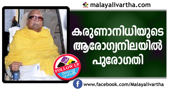 ഗുരുതരാവസ്ഥയില് ആശുപത്രിയില് പ്രവേശിപ്പിച്ച ഡിഎംകെ അധ്യക്ഷനും തമിഴ്നാട് മുന് മുഖ്യമന്ത്രിയുമായ എം. കരുണാനിധിയുടെ ആരോഗ്യത്തിൽ പുരോഗതി. രക്തസമ്മദര്ദം കുറഞ്ഞതിനെ തുടര്ന്നാണ് കരുണാനിധിയെ ആശുപത്രിയില് പ്രവേശിപ്പിച്ചതെന്നും ആരോഗ്യപുരോഗതി വിലയിരുത്താന് വിദഗ്ധ സംഘം എപ്പോഴും കൂടെയുണ്ടെന്നും കാവേരി ആശുപത്രി പുലര്ച്ചെ 2.30ന് പുറത്തിറക്കിയ മെഡിക്കല് ബുള്ളറ്റിനില് അറിയിച്ചു.