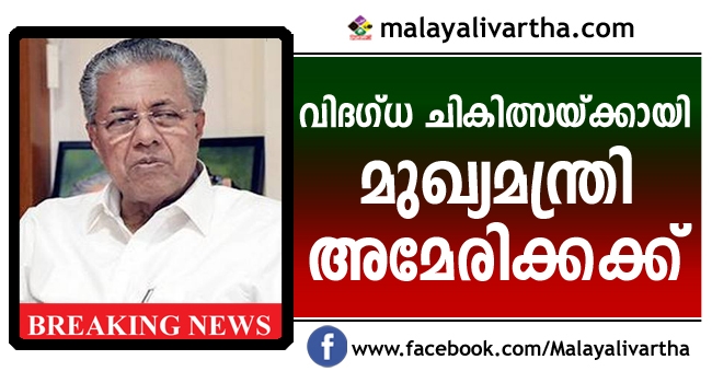 വിദഗ്ധ ചികിത്സയ്ക്കായി മുഖ്യമന്ത്രി പിണറായി വിജയന് രണ്ടാഴ്ചത്തേക്ക് അമേരിക്കയിലേക്ക് പറക്കുന്നു... അടുത്തമാസം 19 മുതലാണ് അമേരിക്കയിലെ മയോക്ലിനിക്കില് ചികിത്സ തേടുന്നത്