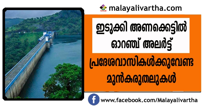 ഇടുക്കി അണക്കെട്ടിലെ ജലനിരപ്പ് 2395 അടിയായതോടെ കെ എസ് ഇ ബി ഓറഞ്ച് അലര്ട്ട് (അതിജാഗ്രതാ മുന്നറിയിപ്പ് )പ്രഖ്യാപിച്ചു. അണക്കെട്ടിന്റെ പരമാവധി ജലവിതാന നിരപ്പ് 2403 അടിയാണ്. തിങ്കളാഴ്ച രാത്രി ഒന്പതിന് നടത്തിയ പരിശോധനയിലാണ് അണക്കെട്ടിലെ ജലനിരപ്പ് ഓറഞ്ച് അലര്ട്ട് പുറപ്പെടുവിക്കുന്നതിനുള്ള പരിധിയായ 2395 അടിയായി ഉയര്ന്നത്. ഓറഞ്ച് അലര്ട്ട് പുറപ്പെടുവിച്ചെങ്കിലും സ്ഥിതിഗതികള് നിയന്ത്രണ വിധേയമാണെന്ന് ജില്ലാ ഭരണകൂടം അറിയിച്ചു. അണക്കെട്ടിനു മുകളില് കണ്ട്രോള് റൂം പ്രവര്ത്തിക്കുന്നുണ്ട്.