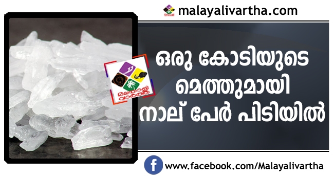 രുചിച്ചാല് വീണ്ടും കഴിക്കാന് പ്രേരിപ്പിക്കുന്ന, മരണം വരെ സംഭവിക്കാവുന്ന മയക്കുമരുന്നായ മെത്തുമായി നാല് പേര് പിടിയില്, കിലോയ്ക്ക് ഒരു കോടിയാണ് മാര്ക്കറ്റ് വില