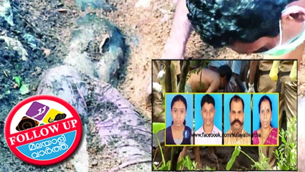 കുഴിയില് നാലുപേരെയും ഒരുമിച്ചിട്ടു മൂടുകയായിരുന്നു. മൃതദേഹം കിടന്ന കുഴിക്ക് രണ്ടര അടി മാത്രമേ ആഴമുണ്ടായിരുന്നുള്ളൂ. കുഴിയില് ഒന്നിനുമുകളില് ഒന്നായി അടുക്കിയിട്ട നിലയിലായിരുന്നു മൃതദേഹങ്ങള്. മകന് അര്ജുന്റെ മൃതദേഹമാണ് പോലീസ് ആദ്യം പുറത്തെടുത്തത്. പിന്നീട് ആര്ഷയുടെയും, സുശീലയുടെയും കൃഷ്ണന്റെയും മൃതദേഹങ്ങള് മണ്ണിനടയില്നിന്നു കണ്ടെടുത്തു. പന്ത്രണ്ടരയോടെ മതേദേഹങ്ങള് ഓരോന്നായി പുറത്തെടുത്തു. ഞായറാഴ്ച വൈകിട്ടുവരെ ഇവരെ വീട്ടില് കണ്ടിരുന്നതായി സമീപവാസികള് പറയുന്നു. രണ്ടു ദിവസമായി ഇവരുടെ യാതൊരു വിവരവും ഇല്ലാത്തതിനാലാണ് വീട്ടിലേക്ക് അന്വേഷിച്ചെത്തിയത്.