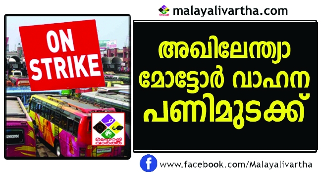 ചൊവ്വാഴ്ച അഖിലേന്ത്യ മോട്ടോര് വാഹന പണിമുടക്ക്. കേന്ദ്ര സര്ക്കാരിന്റെ നിര്ദിഷ്ട മോട്ടോര് വാഹന നിയമ ഭേദഗതി പിന്വലിക്കുക, ഇന്ഷുറന്സ് പ്രീമിയം വര്ധിപ്പിച്ചത് പിന്വലിക്കുക, പെട്രോളിയം ഉത്പന്നങ്ങളുടെ വിലക്കയറ്റം നിയന്ത്രിക്കുക തുടങ്ങിയ ആവശ്യങ്ങള് ഉന്നയിച്ചാണ് ഓള് ഇന്ത്യ മോട്ടോര് ട്രാന്സ്പോര്ട് ഓര്ഗനൈസേഷന്റെ നേതൃത്വത്തില് പണിമുടക്ക്.